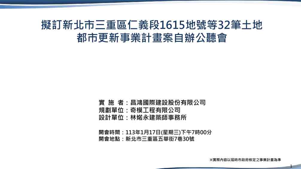 擬訂新北市三重區仁義段1615地號等32筆土地都市更新事業計畫案自辦公聽會